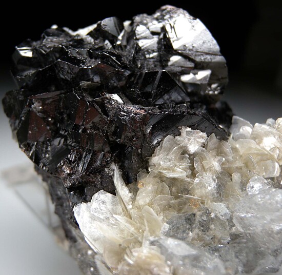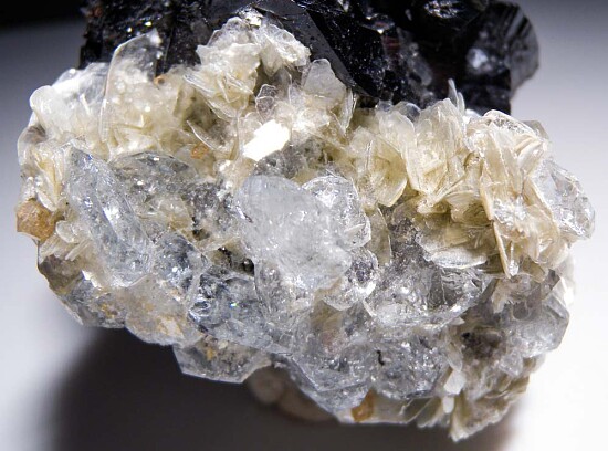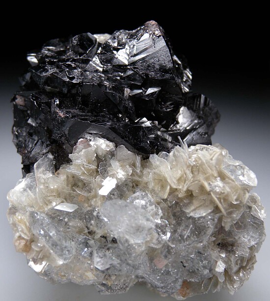 Highly lustrous clusters of twinned black Cassiterite crystals on Muscovite. Glassy, transparent Aquamarine crystals (about 15 crystals) are intermixed with the Muscovite. A showy combination specimen from a recently acquiredd collection valued at $300.