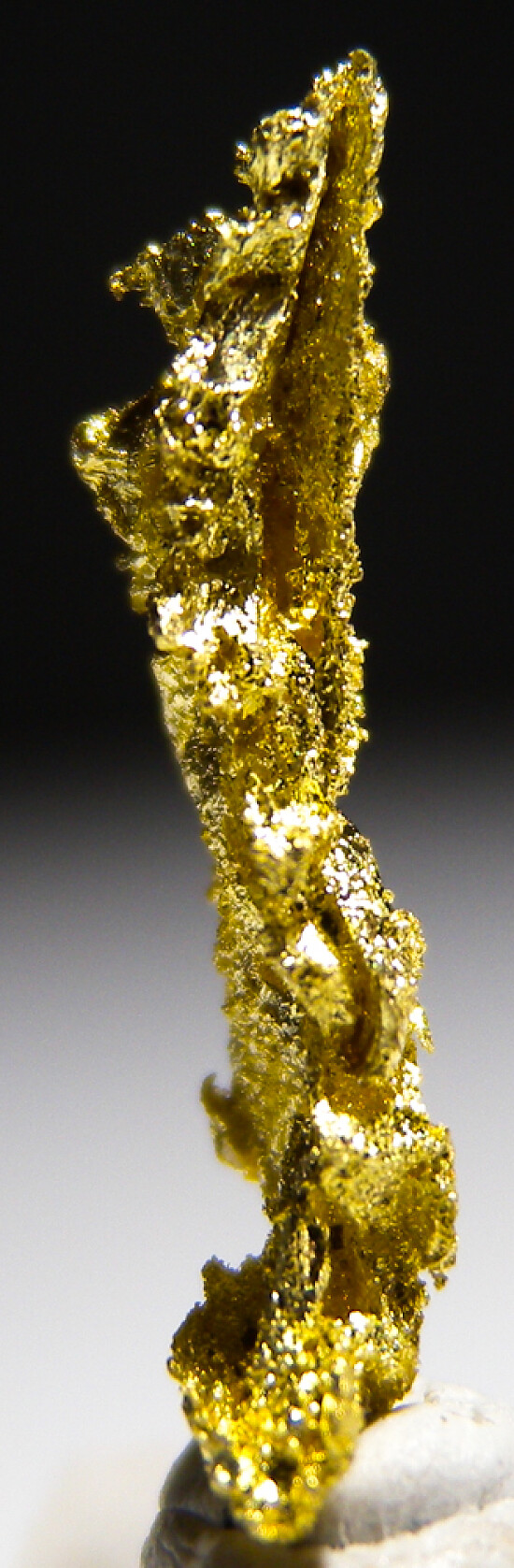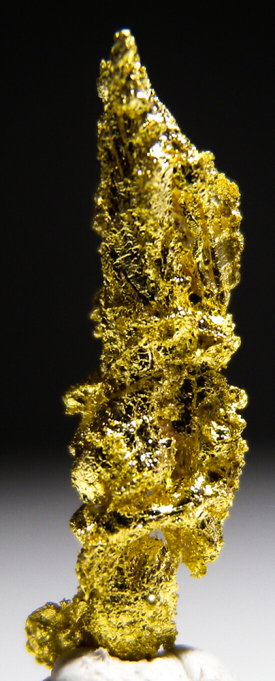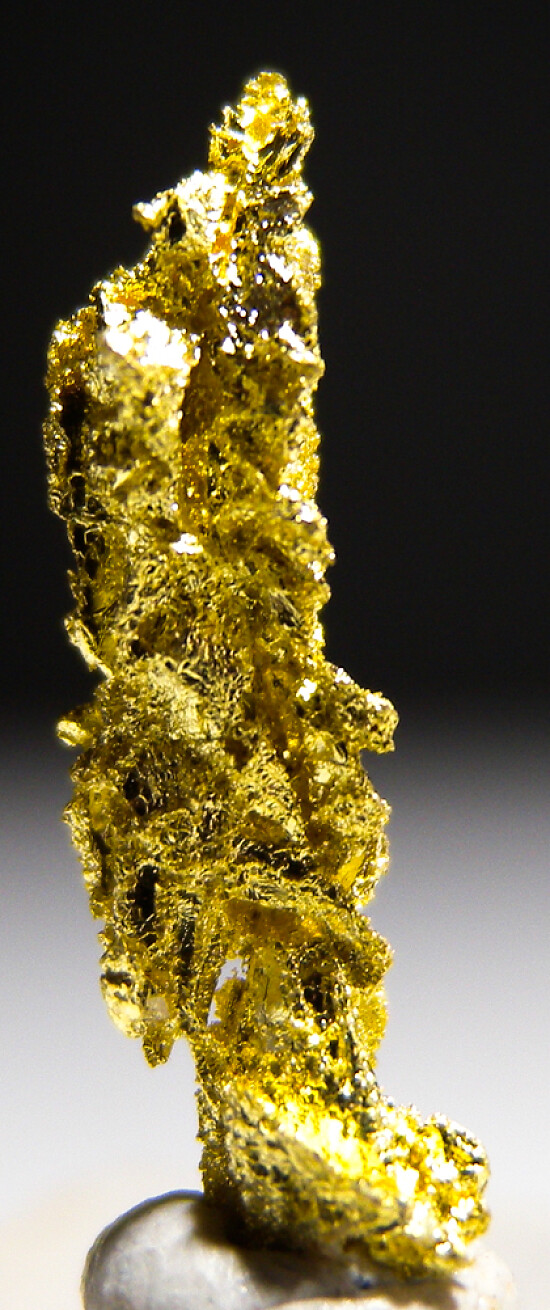 Bright metallic 1.8cm spinel twinned Gold crystal from recent finds in Morocco. Good crystal structure that forms ridge-like rows up the sides. Weighs 0.83 grams.