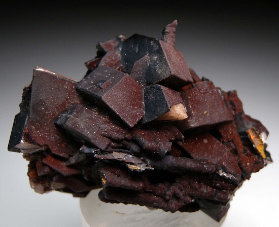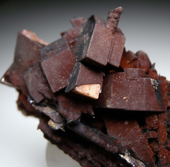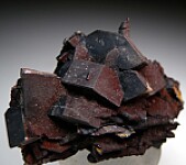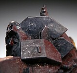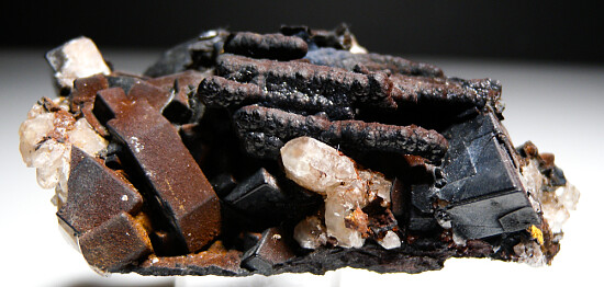 Well formed, blocky crystals of Cerussite pseudomorphs after Anglesite from Broken Hill. This is from a limited 1989 find and has crystals to 2.1cm wide that occur with Coronadite stalactites. The Cerussite crystals are also coated in Coronadite but the white Cerussite can be seen on the tip of one crystal.