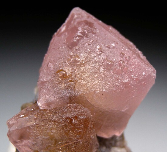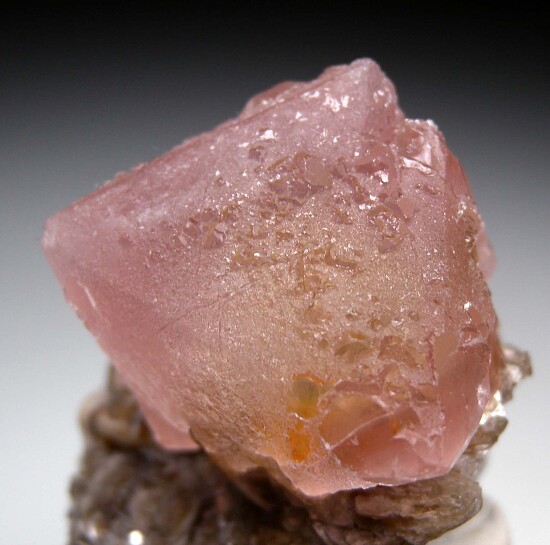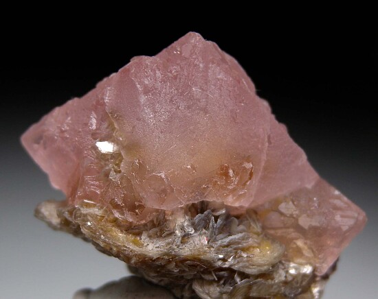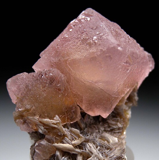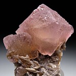 Pink octahedral Fluorite crystals on a matrix of Muscovite crystals. The largest Fluorite is 3.5cm wide. The Fluorite is translucent to transparent and has small surface growth features and a mixture of glassy and matte surface luster. Aesthetic miniature that is undamaged.