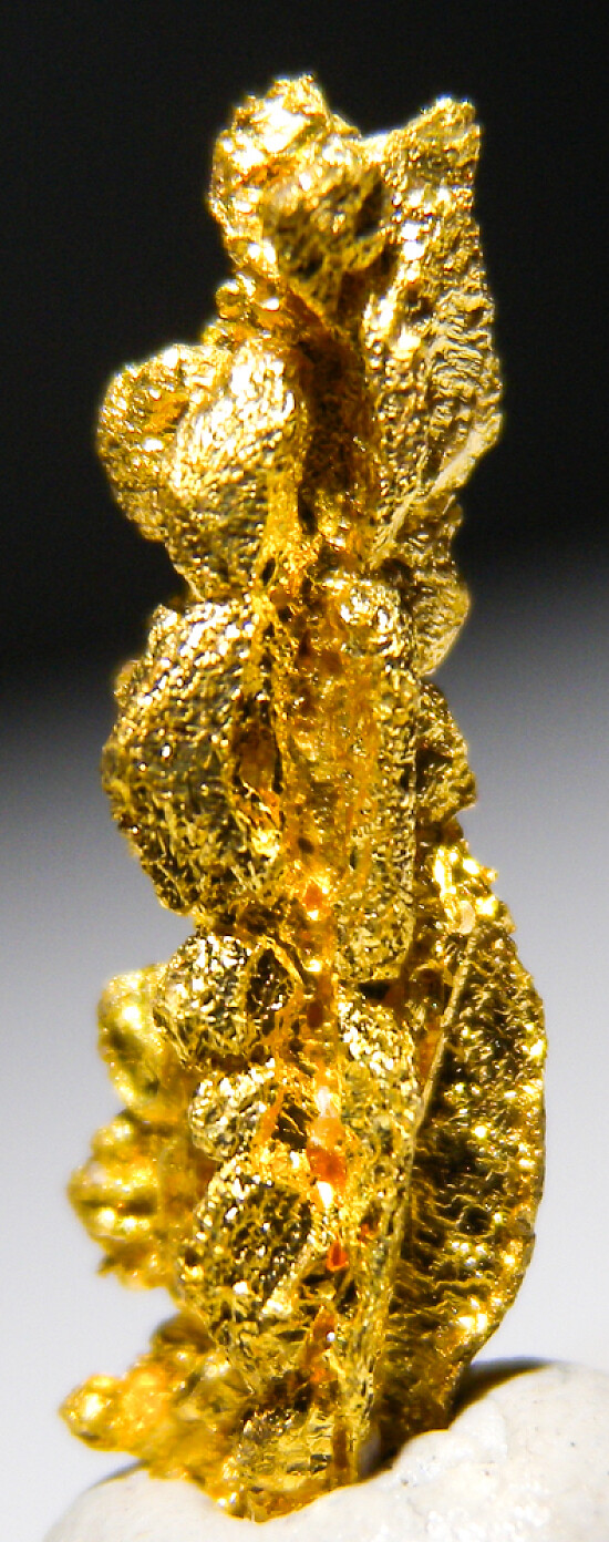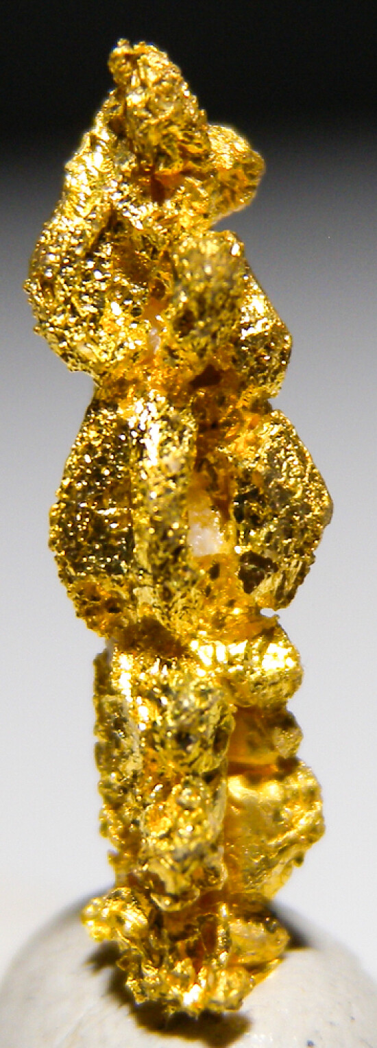 Bright metallic 1.8cm spinel twinned Gold crystal from recent finds in Morocco. Good crystal structure that form six ridge-like rows up the sides. Weighs 1.55 grams.