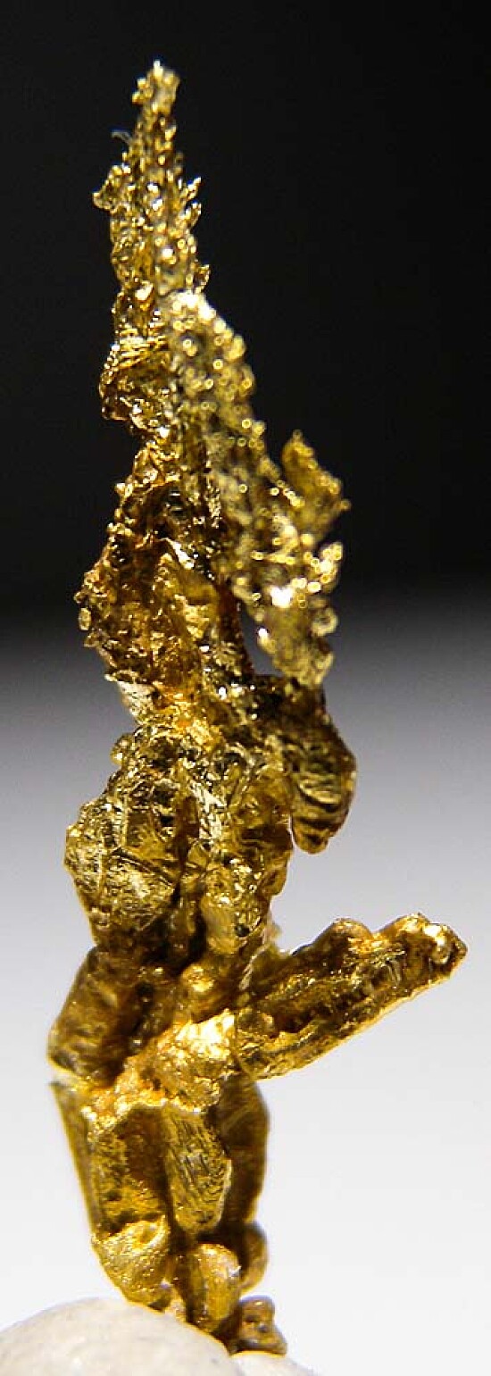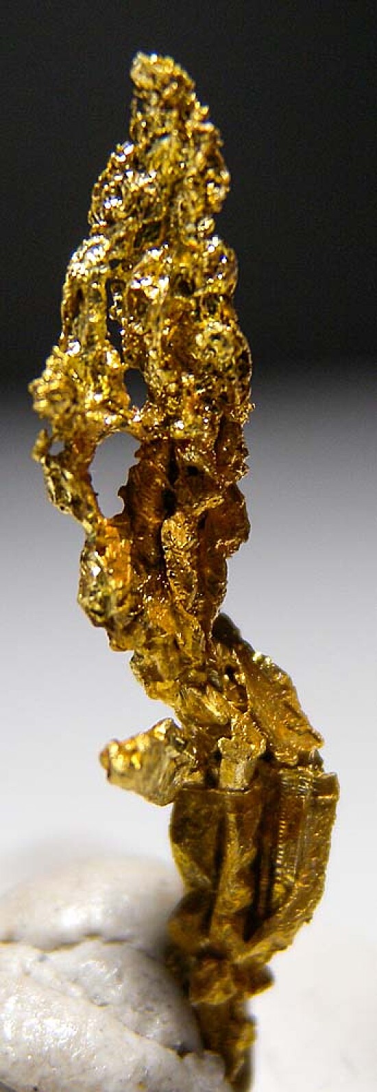 Bright metallic 2.5cm spinel twinned Gold crystal from recent finds in Morocco. An elongated, well crystallized specimen. Weighs 1.04 grams.