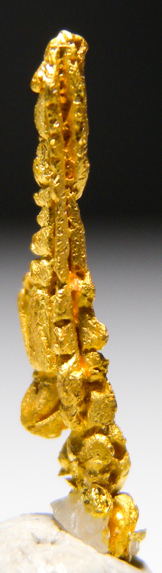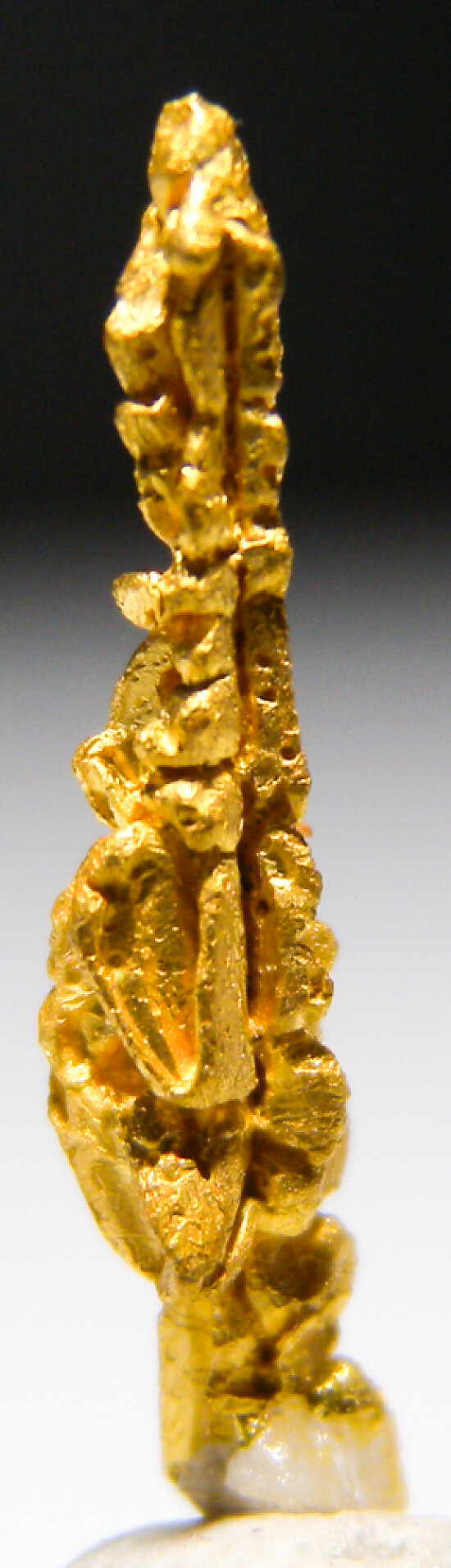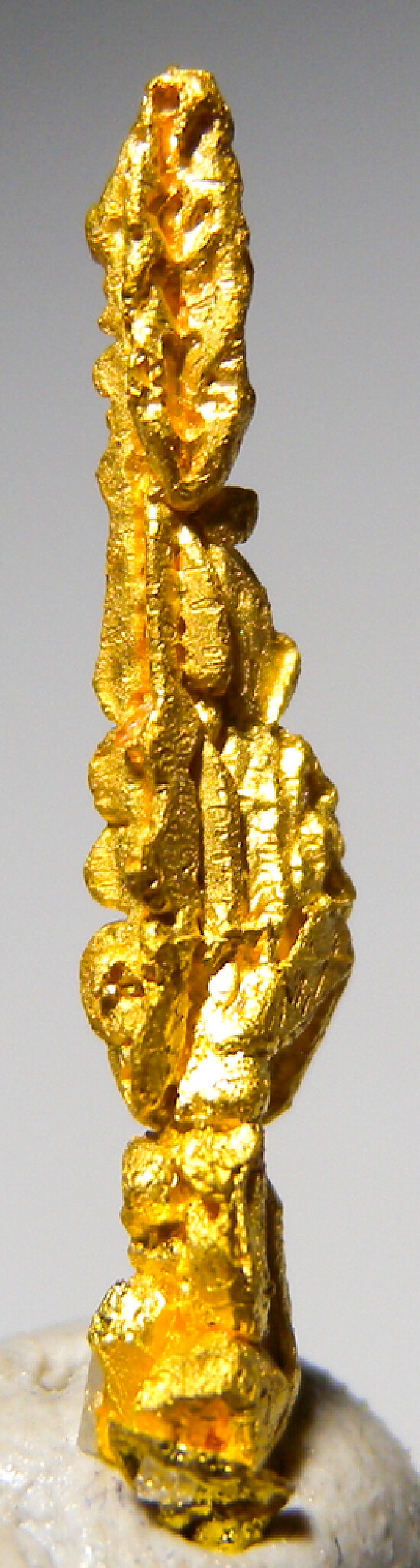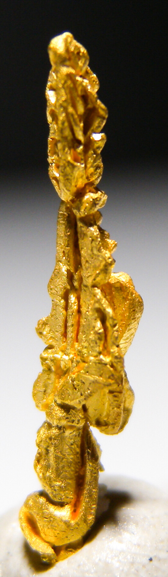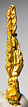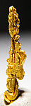 Bright metallic 1.7cm spinel twinned Gold crystal from recent finds in Morocco. An elongated, well crystallized specimen. The crystal definition on these specimens varied greatly - as seen in the photos, this is a well crystallized example showing good crystal faces all around. Was listed at $300 in my regular website galleries. Weighs 0.46 grams.