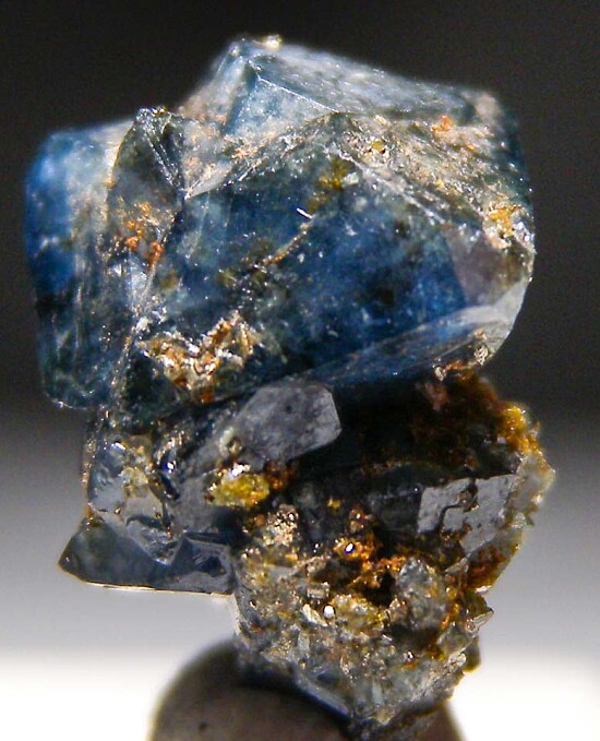 Cluster of blue Scorodite crystals with crystals to 1cm in size. The Scorodite are are lightly coated by golden brown Beudantite crystals (an uncommon lead, iron arsenate mineral). Floater cluster well crystallized all around.