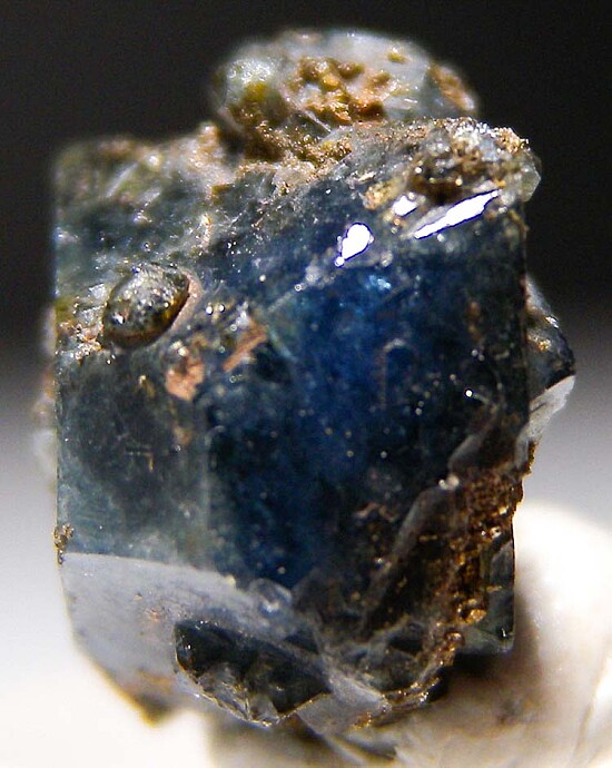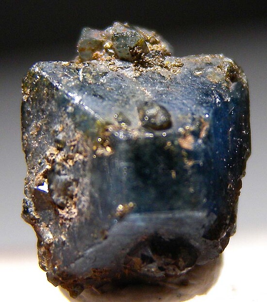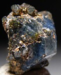Thick single crystal of blue Scorodite crystal lightly coated by golden brown Beudantite crystals (an uncommon lead, iron arsenate mineral). Complete floater single crystal with smaller attached crystals.