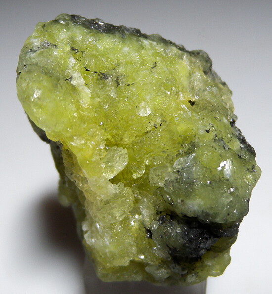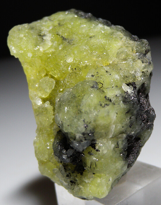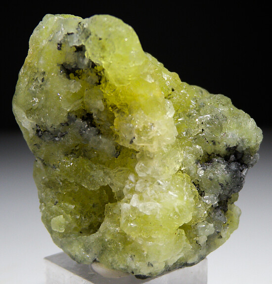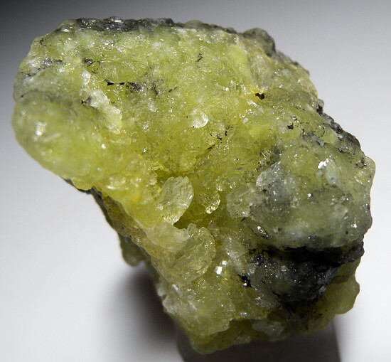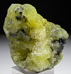 Prehnite from the Merelani Tanzanite mines is well known as some of the best in the world. This specimen is composed of bright lemon yellow Prehnite with areas of attached Graphite. There are mulitple vugs of well formed translucent crystals.