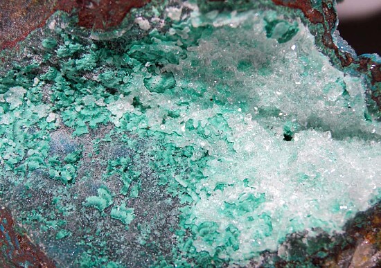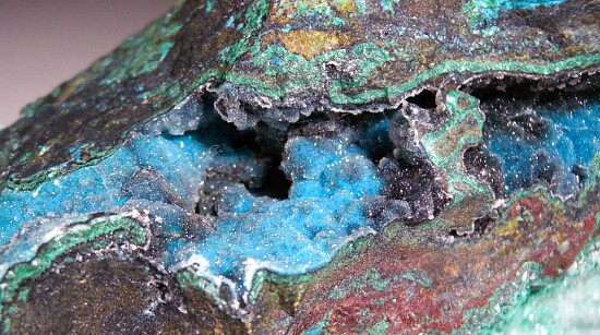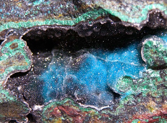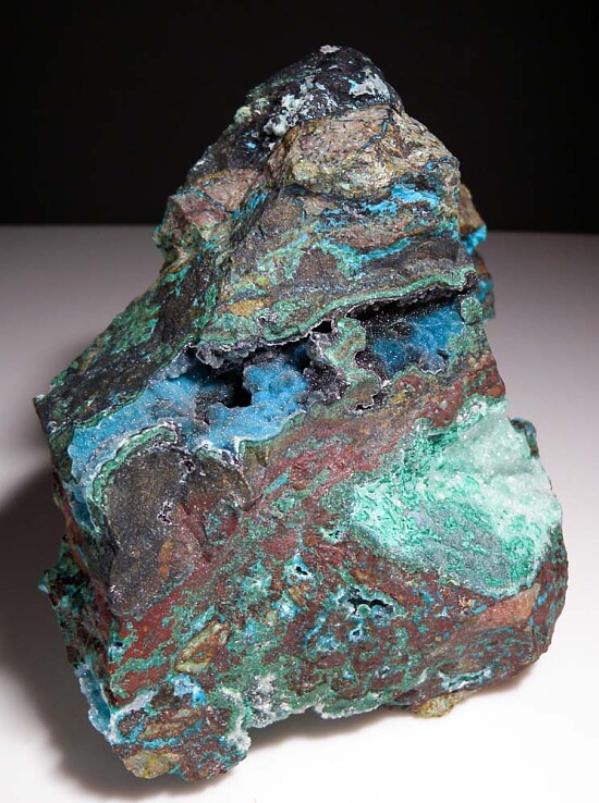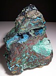 Large, colorful specimen with multiple vugs filled with drusy Quartz over colorful Malachite and Chrysocolla. This is an old collection piece with no spcific mine attributed. A big piece that could be trimmed into multiple specimens of used as lapidary material. Some vugs show Quartz over darker blue Chrysocolla and some have Quartz over green Malachite. There are many crystallized areas not pictured - too many to show!