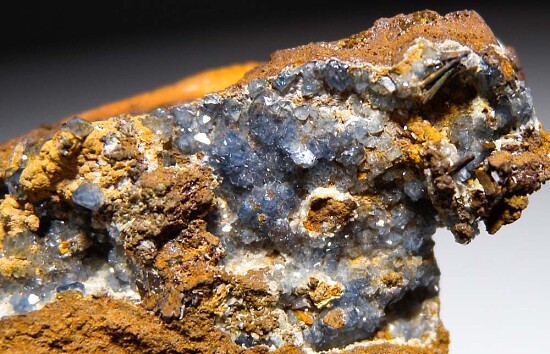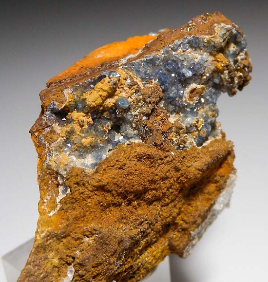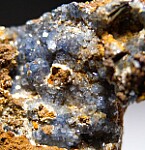 Glassy blue Scorodite crystals on matrix from a major find a few years ago. There are dozens of great crystals all over, front and back and filling vugs. The crystals are sharp and glassy with transparency. There is also Selenite and other minerals present. Lots of places to explore with a hand lens.