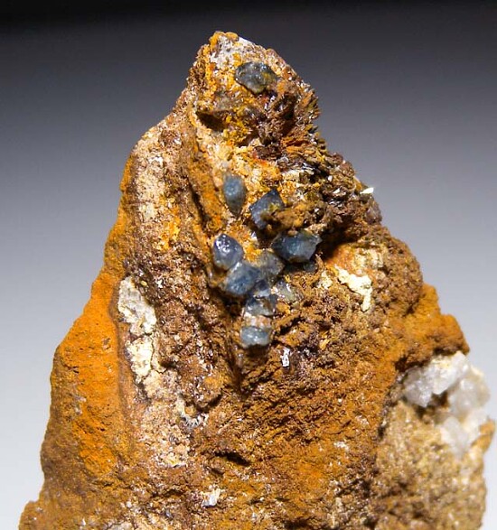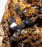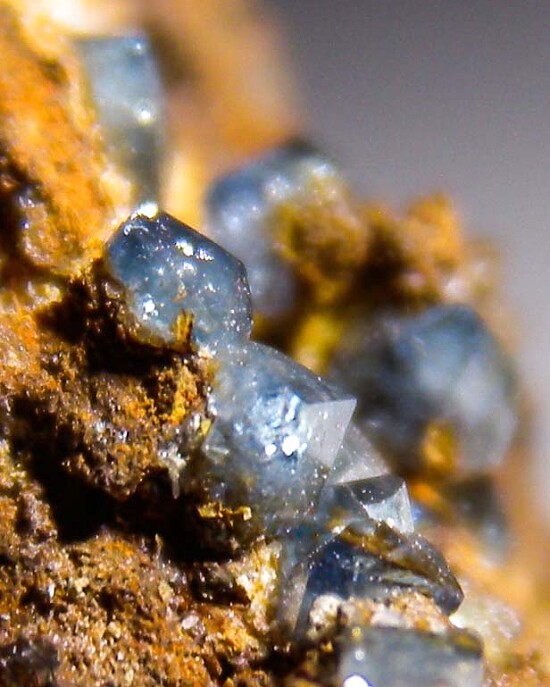 Glassy blue Scorodite crystals on matrix from a major find a few years ago. There are about 10 crystals, sharp and glassy with transparency.