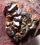 Cluster of large Scorodite crystal on Limonite matrix. These are not only big crystals (to 7mm on edge), they have an unusual reddish green coloration. I obtained this from Marshall Sussman who had these analyzed to try and determine the cause of the coloration, but results were inconclusive.