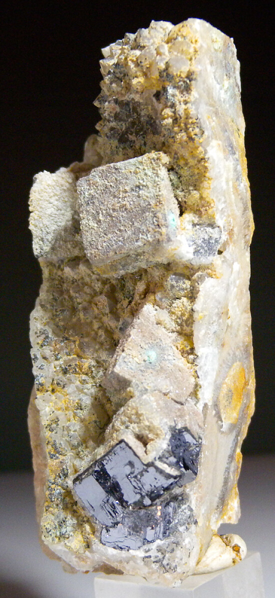 Galena cubes with surface alterations to Anglesite atop drusy Quartz crystals. A nice good sized and aesthetic example.