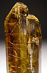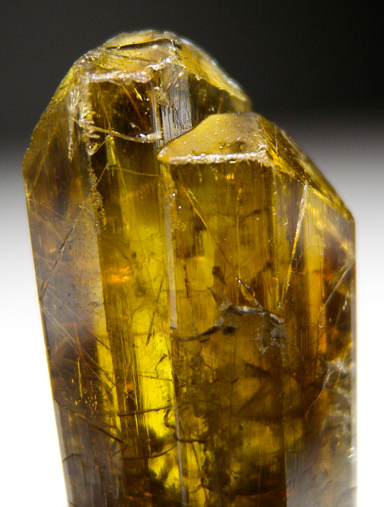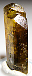 Rare gem Chrysoberyl crystal from Espirito Santo (possibly Santa Teresa though old label says Colatina) that does not have the typical sixling twinning. This crystal has smooth, sharp, well-formed faces all around and a greenish-yellow, golden coloration. Undamaged and gemmy top to bottom.