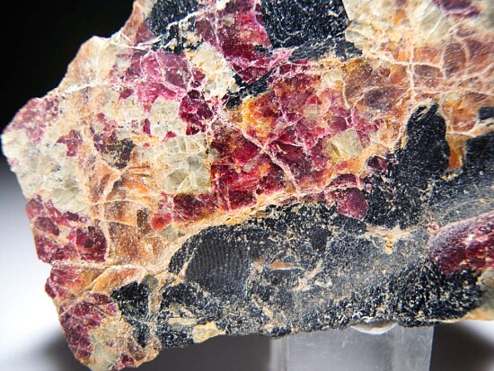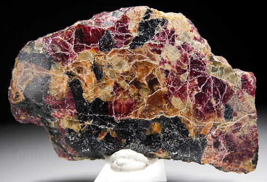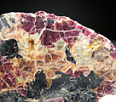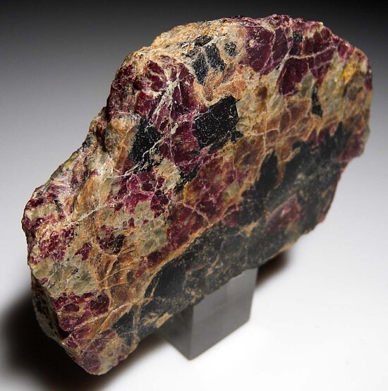 Polished slab containing red Garnets. This came to me in an old garnet collection without any locality information. Lots of purply/red garnets showing, polished on both sides.