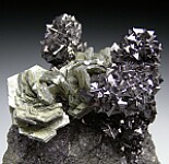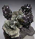 Formations of shiny black Magnetite crystals with green flower-like crystal groups of Clinochlore from an obscure deposit in Kazakhstan. This was easily the most aesthetic example I selected from a few flats of this material available at the Tucson show back in the 1990s.