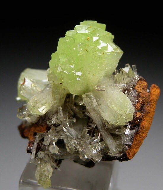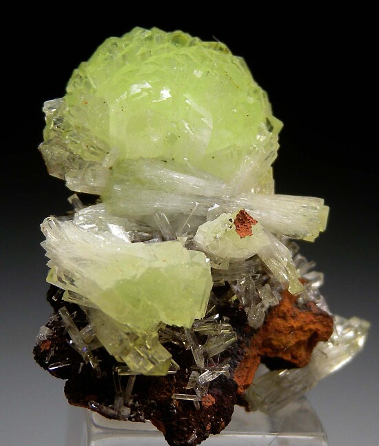 Glassy Adamite crystals on Limonite. There are both individual crystals, doubly-terminated crystals, and a large pinwheel cluster. What makes this special is the more green than yellow color and the aesthetic arrangement of the crystals. Undamaged fine miniature.