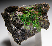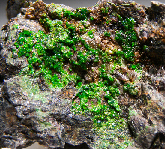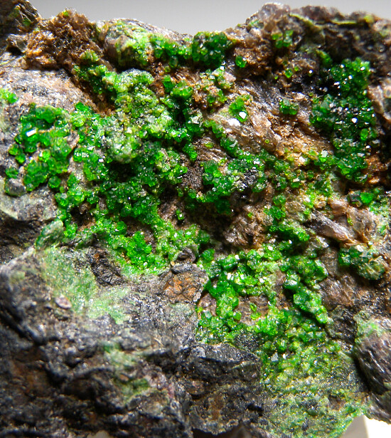 Sparkling, vivid green crystals of Uvarovite garnet on a Chromite matrix. An old specimen collected by Chuck Trantham decades ago, these are rare California specimens not commonly seen. This has a good coverage of crystals on the front display face.