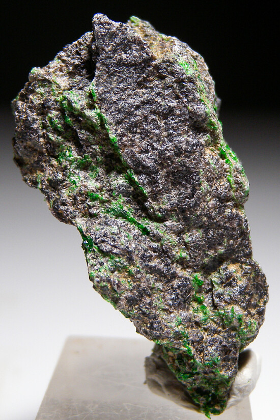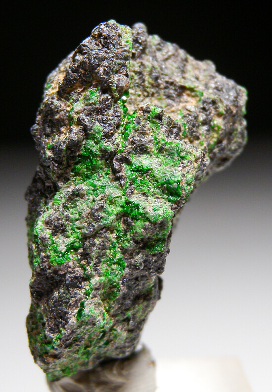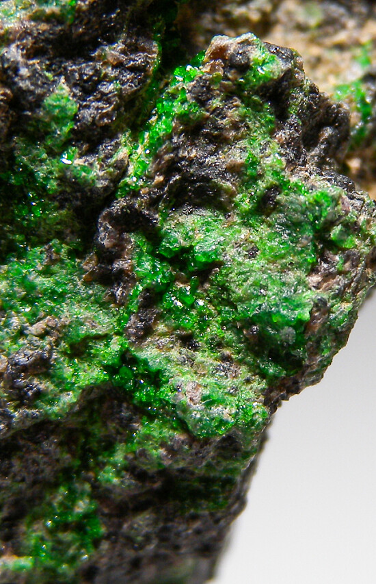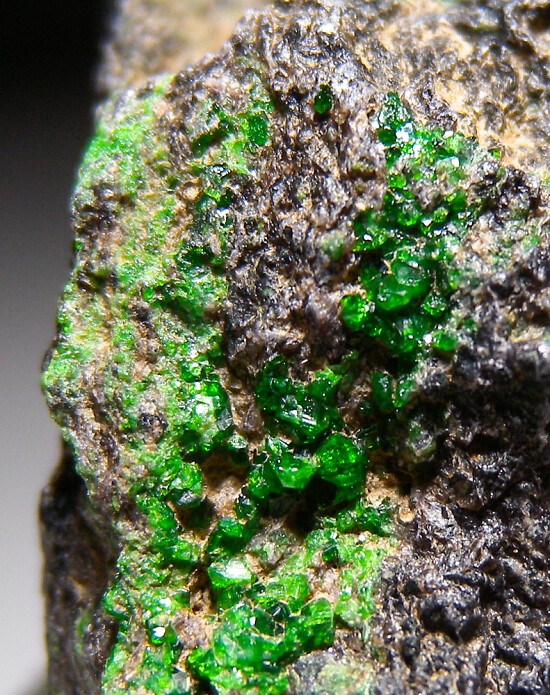 Vivid green Uvarovite crystals on Chromite matrix, a rarity for California. Small, brightly colored crystals are present on most sides of the specimen. Collected decades ago by Chuck Trantham.