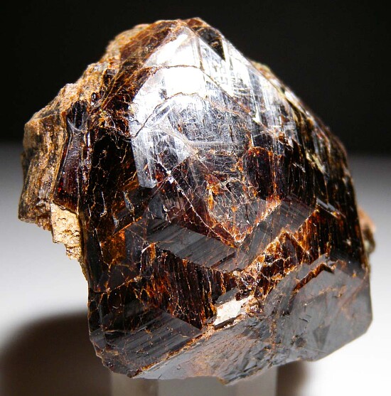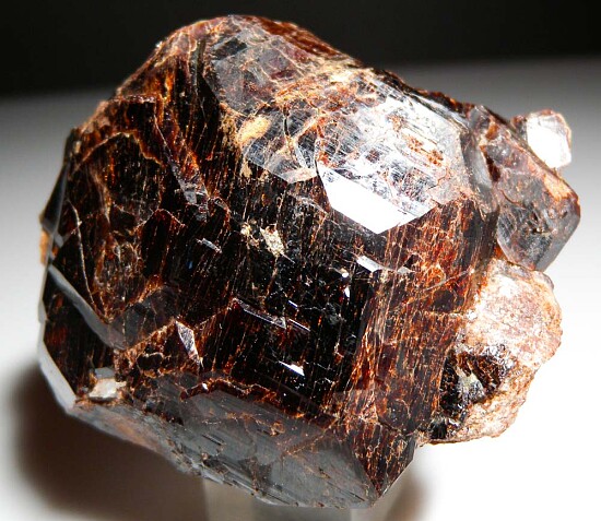 Large single red Andradite crystal from the Garnet Hill Mine. Many of these garnets underwent various cycles of pseudomorphing between Andradite and Epidote, and in this one, you can see a bit of green Epidote under the Andradite.