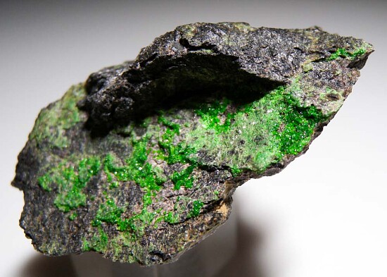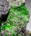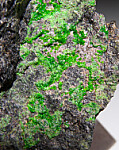 Sparkling green crystals of Uvarovite that contrast well against the dark Chromite matrix. These are rare for California. Old speciemn collected decades ago by Chuck Trantham.