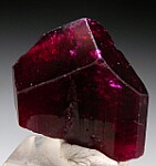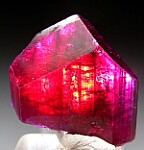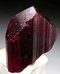 Single Liddicoatite crystal with an incredible, intensely saturated red coloration. There is chatter/damage along the short edge but it's in overall good condition with nice flat termination faces. This specimen is all about the strong color, which to my eyes varies from a cranberry red to a raspberry red. Weighs 8 grams.