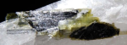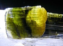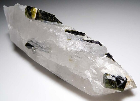 Large Quartz crystal with attached and included Tourmaline crystals. The Tourmaline range in color from yellow to green to dark green and almost colorless. They reach about 4cm in size, with some on the outside and some almost entirely included within the Quartz. Neat large piece!