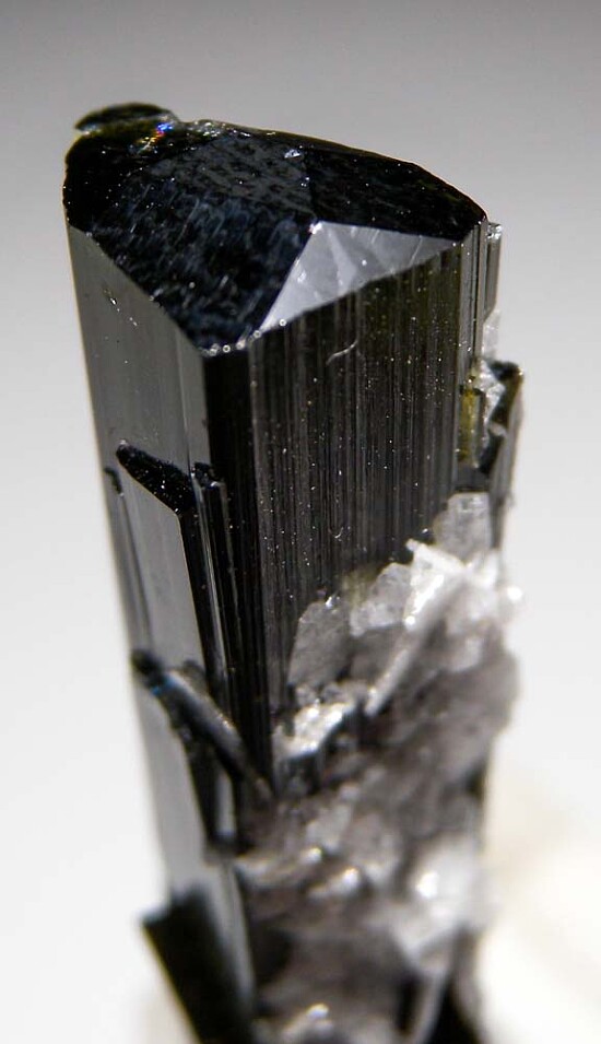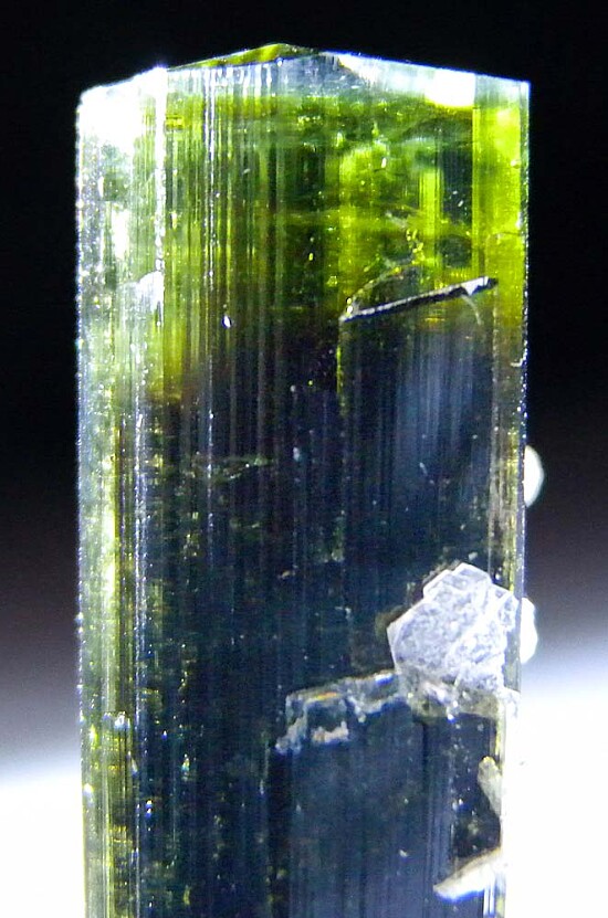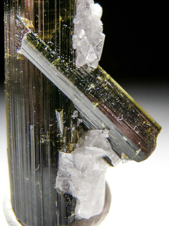 Well terminated single Tourmaline crystal with attached Albite crystals. Transparent green at the termination with bevelled termination faces. Platy white Albite crystals are attached to the side. Much better than photos!!!