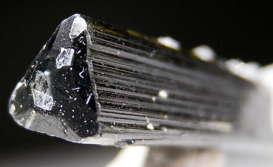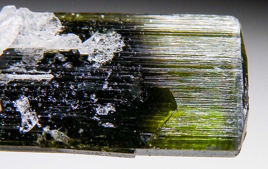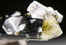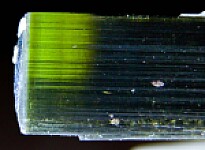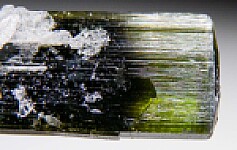 Complete, doubly-terminated single Tourmaline crystal from Stak Nala with attached Clevelandite. The crystal is dark in the middle with a transparent green termination at one end and a yellow color at the other termination. Fine and undamaged crystal, better than photos and valued at $200.