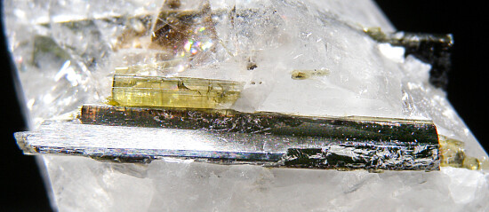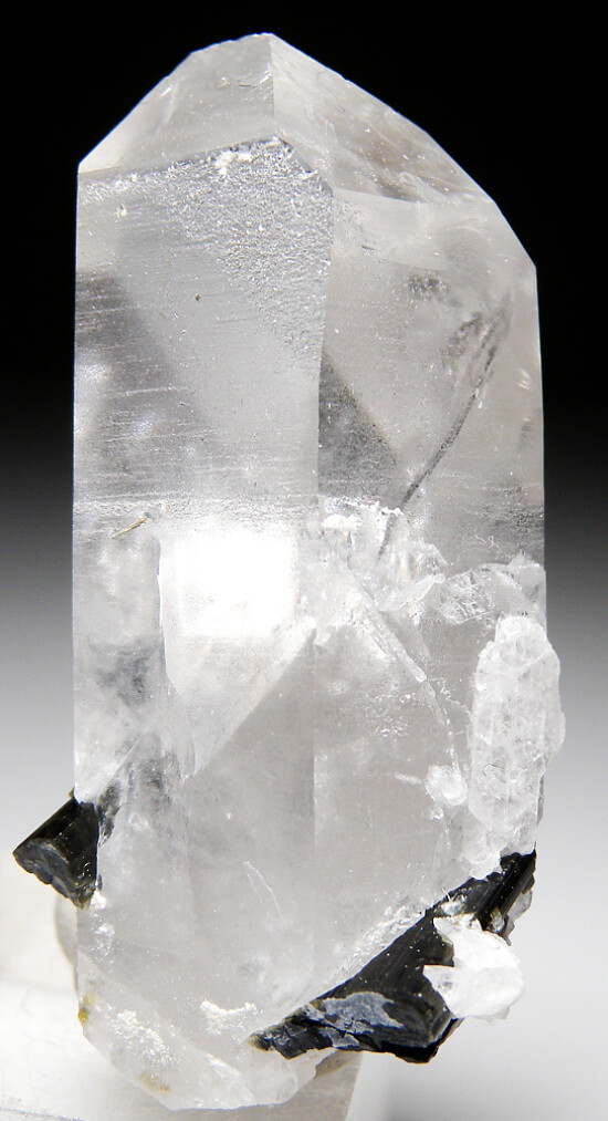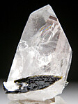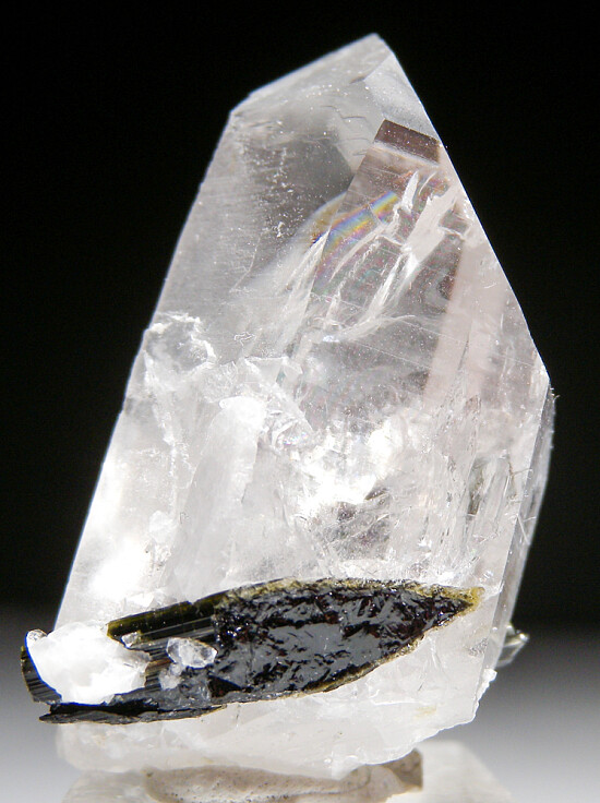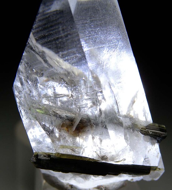 Single clear Quartz crystal with an included Tourmaline crystal. The Tourmaline is 2cm in length with the terminated green end completely enclosed wthin the Quartz. The Quartz crystal itself is complete all around, sharp and lustrous and undamaged. It has a couple partial Tourmaline crystals attached at the base.