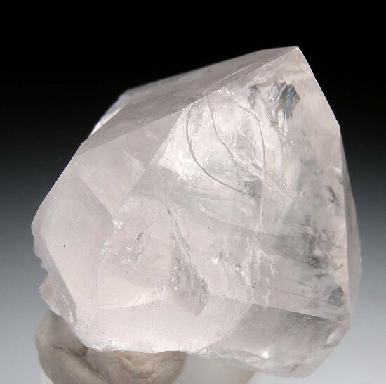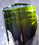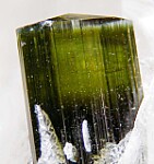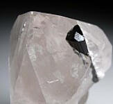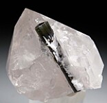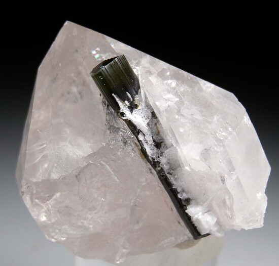 A single Tourmaline on a a Quartz crystal is one of the most iconic of all mineral specimens. Here we have a glassy, thick Quartz crystal with partially included terminated Tourmaline crystal. The Tourmaline has a perfect, beveled termination and is a transparent green at the top. The Quart is transparent and glassy. Very nice!!!