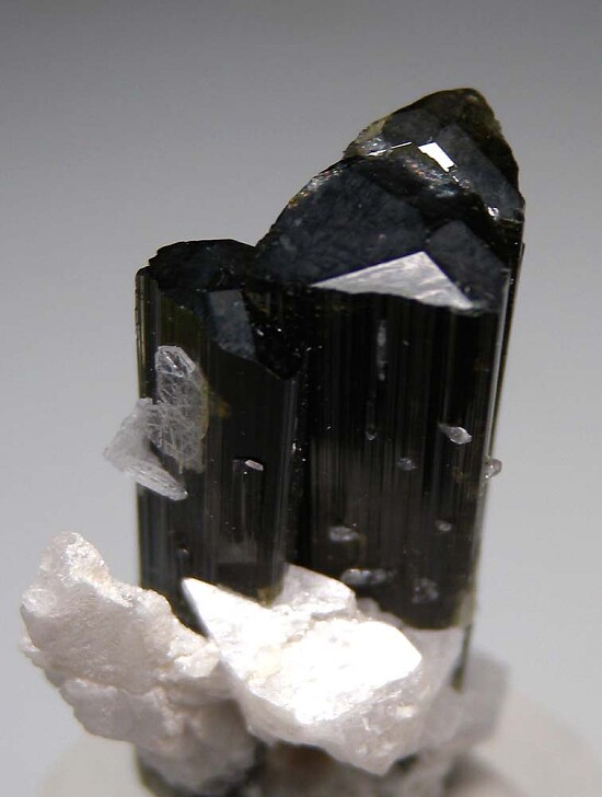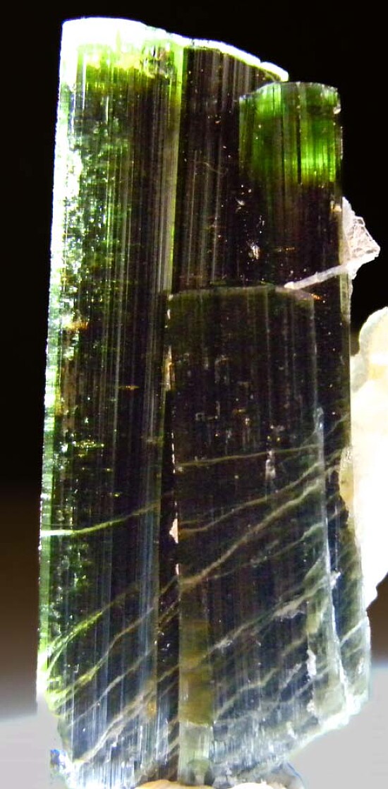 Cluster of parallel grown, terminated Tourmaline crystals with attached Albite crystals. Gemmy green at the tips and complete all around cluster without damage. Smooth, glossy termination faces with striated prism faces.