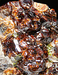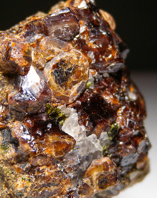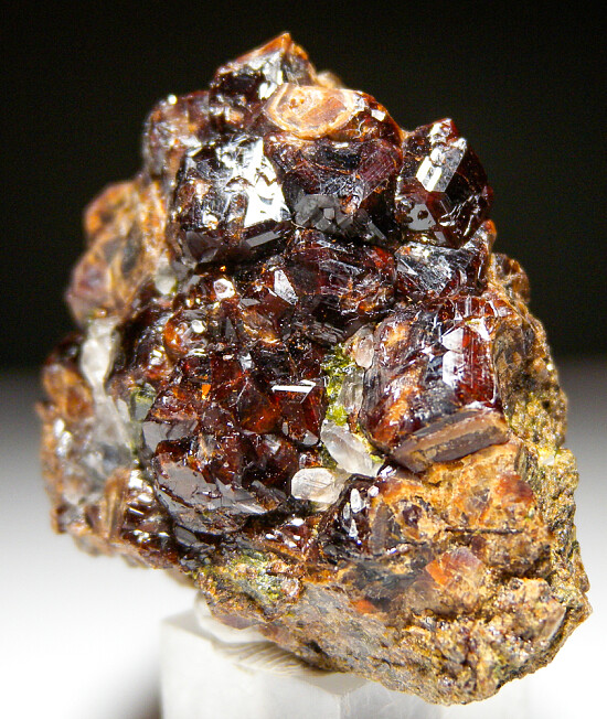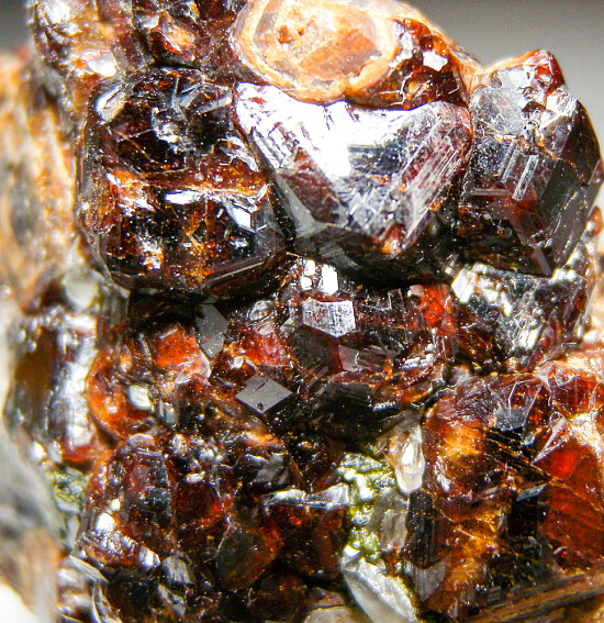 Cluster of deep red Andradite garnet crystals to 1cm on matrix associated with green Epidote. Collected by John Sulzbach in 2002.