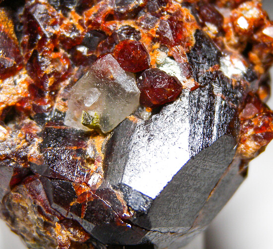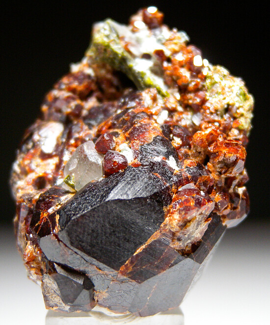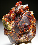 Cluster of deep red Andradite garnet crystals to 3cm on matrix associated with green Epidote. Collected by John Sulzbach in 2001.