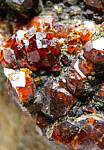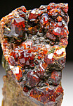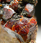 Cluster of deep red Andradite garnet crystals to 1cm on matrix associated with green Epidote. Collected by John Sulzbach in 2001.