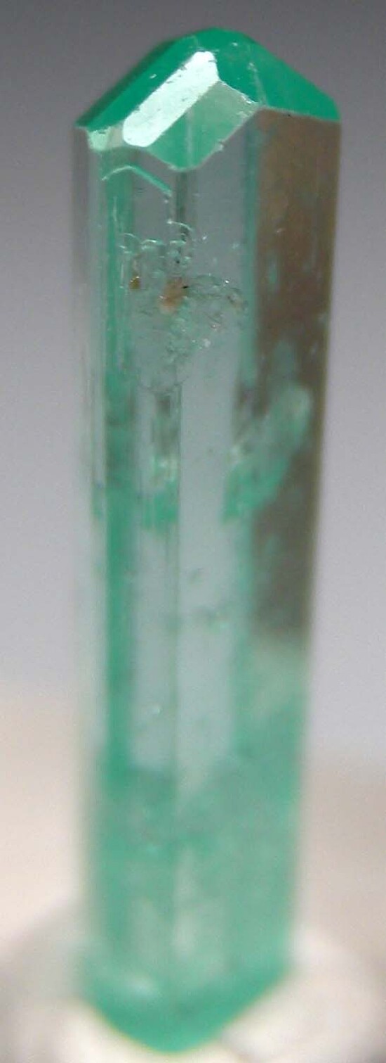 Single gem quality Emerald crystal from old finds in Jos, Nigeria. Highly transparent with a steep beveled termination. Complete all around and nearly pristine with just one small edge nick.