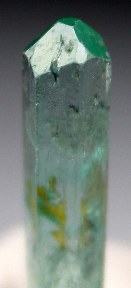 Single gem quality Emerald crystal from old finds in Jos, Nigeria. Highly transparent with a steep beveled termination. Complete all around and undamaged.