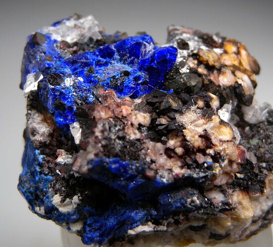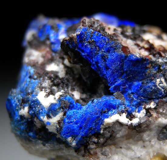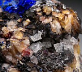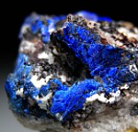 Vivid deep blue Linarite crystals with Cerussite in Quartz crystal lined vugs. The Linarite form platy, unterminated crystals.