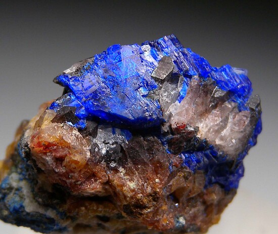 Vivid deep blue Linarite crystals with Cerussite on Quartz crystal lined vugs. The Linarite form platy, colorful crystals.