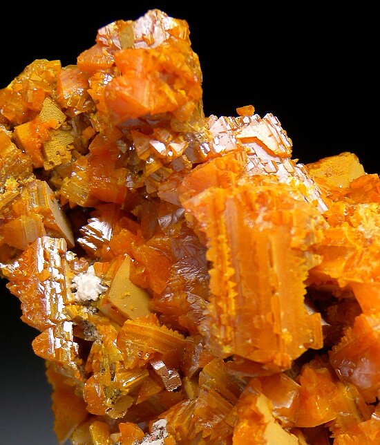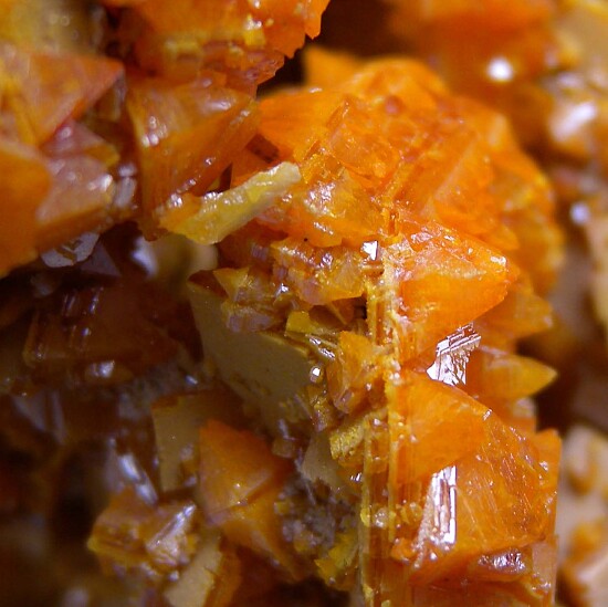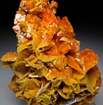 Cluster of interconnected orange Wulfenite crystals from Mezica, Slovenia (likely from the Staro Igrcevo Mine). There are 3 generations of Wulfenite on this large specimen, starting with thinner, more yellow bladed Wulfenite on the base, followed by thicker, tabular orange crystals. A third generation of sharp pyramidal form grew vertically off the faces of the second generation tabular crystals.