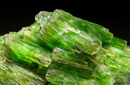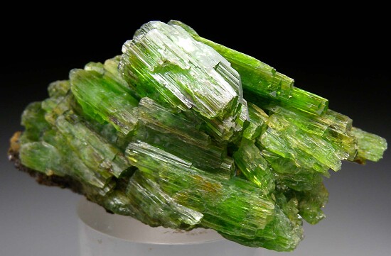 A cluster of vivid green, doubly-terminated Tremolite crystals stacked like logs atop a small amount of matrix. Merelani Tremolite is the world's best for species but usually occurs only as single crystals. This is a rare, sizable matrix specimen of multiple crystals.