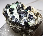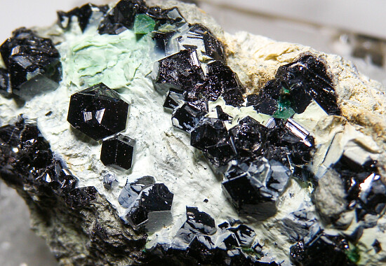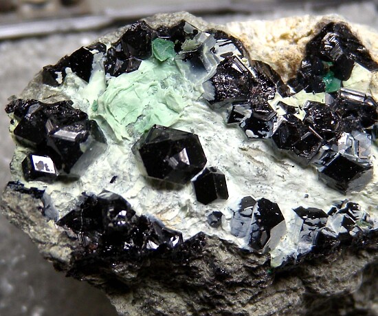 Shiny black Andradite var. Melanite crystals on matrix with green Chrysocolla. Ewell's label indicates Copper however I see no Copper present.