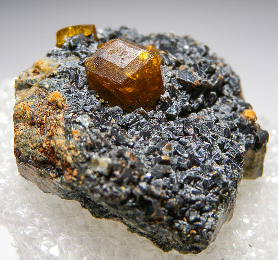 Golden colored Topazolite crystals and dark green Clinochlore on matrix. The Topazolite crystals reach 8mm.