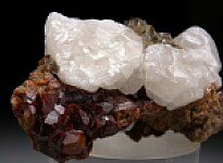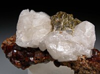 Uncommon combination of white Scheelite, green Epidote, and reddish brown Grossular crystals from Mexico. Fluorescent. Comes with a Dan Weinrich label.