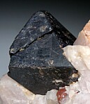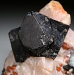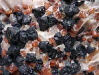Black Franklinite crystals to over to 3cm in matrix. The largest crystal has a fracture that has possibly been repaired. The large crystals are in a matrix of white Calcite, orange Willemite, and smaller Franklinite crystals. The Willemite are bright green under fluorescent lighting. Despite the repair this is a good Franklinite I had listed at $450 in my regular website galleries.