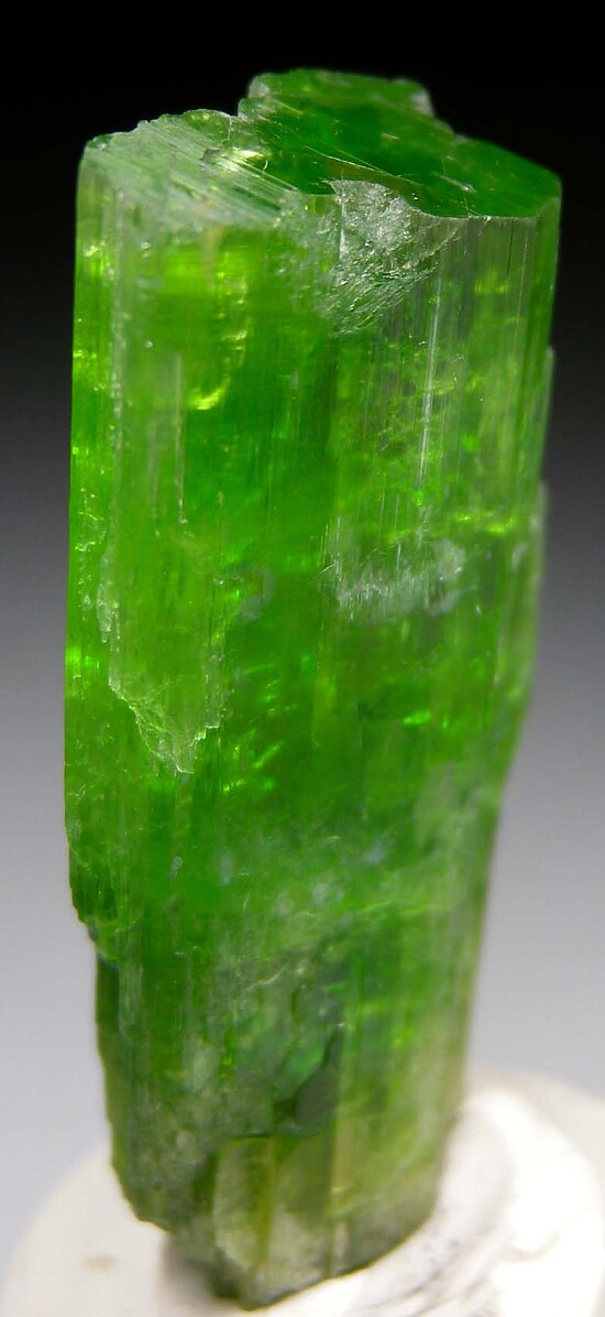 Large single green Tremolite crystal from the Merelani Tanzanite mines. This is a big one with a smooth, flat termination face and typical splintery edges. Gemmy with superb, vivid green coloration. These are only occassionally found and usually in smaller sizes - at nearly 5cm tall this is much bigger than most. I have seen some longer than 4.8cm, but they are usually thinner crystals - this one is thick and robust.
