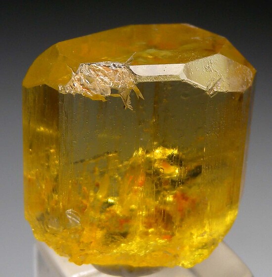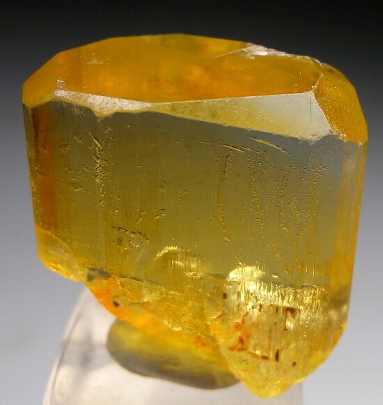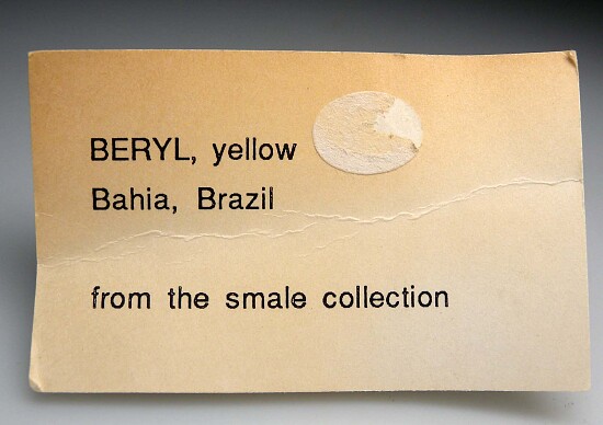 Single gem Heliodor crystal from Brazil. This is nearly all transparent, facet quality Heliodor with top saturated pure yellow color. Well terminated and complete all around. There is a small area of contact/growth interuption (not damage) along one termination edge, otherwise it's perfect. Ex. Steve Smale collection with his old label. Weighs 62.4 carats (Note that this crystal has significant gem rough value. A hypothetical 35% yield would give 21 carats in gems, and with top color Heliodor selling for $150-$200/carat, a hypothetical $3,150-$4,200 value).