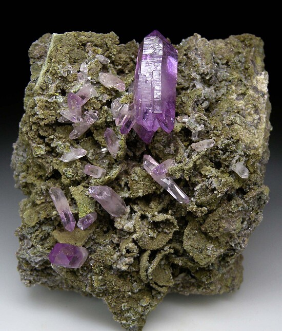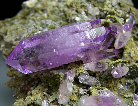 Colorful, fine quality Amethyst specimen from Las Vigas. The Amethyst occur on a highly textured matrix colored green by coatings of Epidote that creates a great color contrast against the deep purple Amethyst. The Amethyst are mostly doubly-terminated, undamaged, and highly transparent. The largest crystal is 3.3cm long. Great specimen that's a little different looking than your average Las Vigas Amethyst.