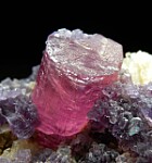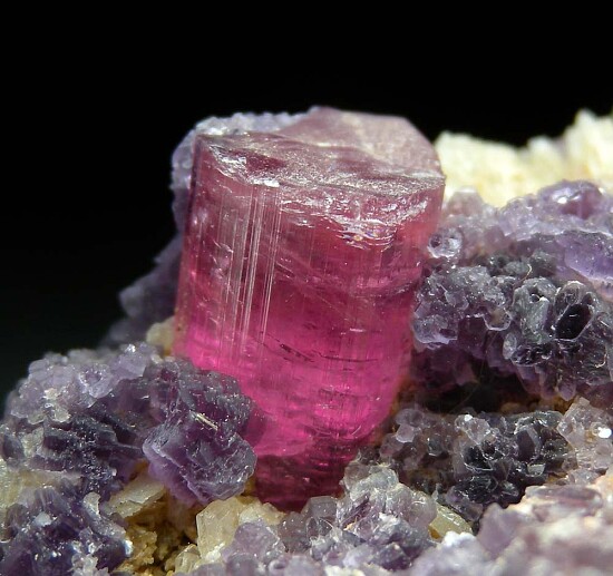 Bright 'Hot' pink Tourmaline with purple Lepidolite on white Albite crystals. There are 7 Tourmaline crystals showing on the top, and more showing on the bottom. The crystals reach 1cm in diameter and have the incredible pink color this mine is known for.