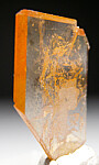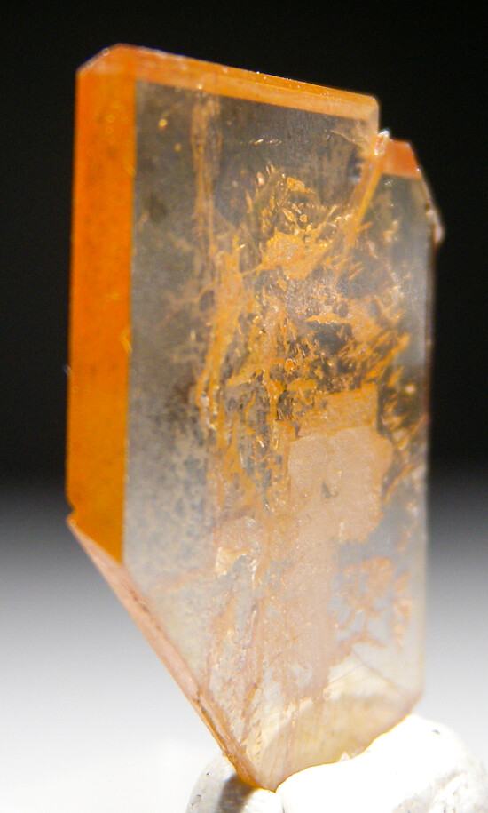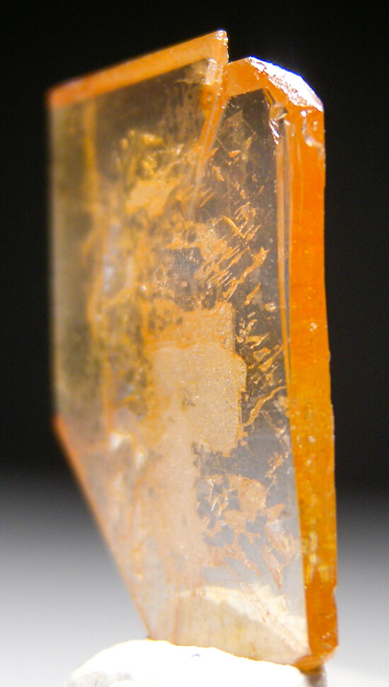 Transparent single crystal of Wulfenite from Tsumeb. Well crystallized, undamaged top and side edges with an orangey coloration. Classic 'window pane' Wulfenite crystal.