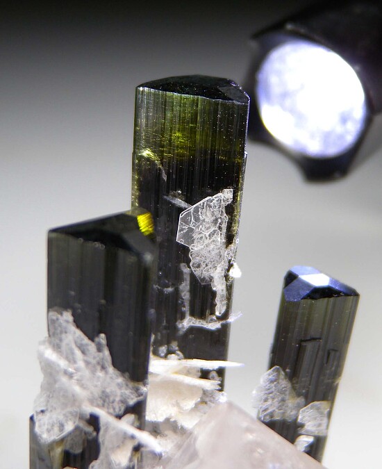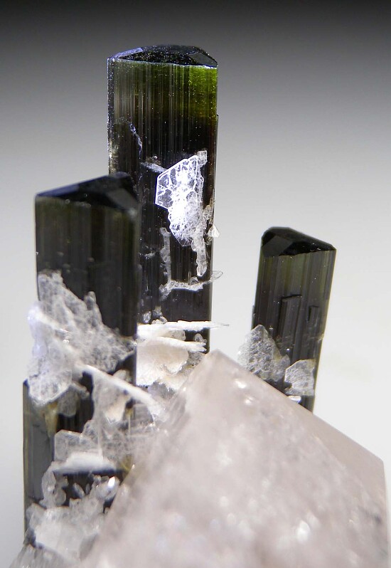 Four Tourmaline crystals attached to a transparent single Quartz crystal. Three Tourmaline rise up from behind the Quartz crystal and the fourth Tourmaline is inclued within the Quartz crystal. The Tourmaline are terminated and undamaged with darker bodies and transparent green terminations. Highly attractive specimen!
