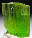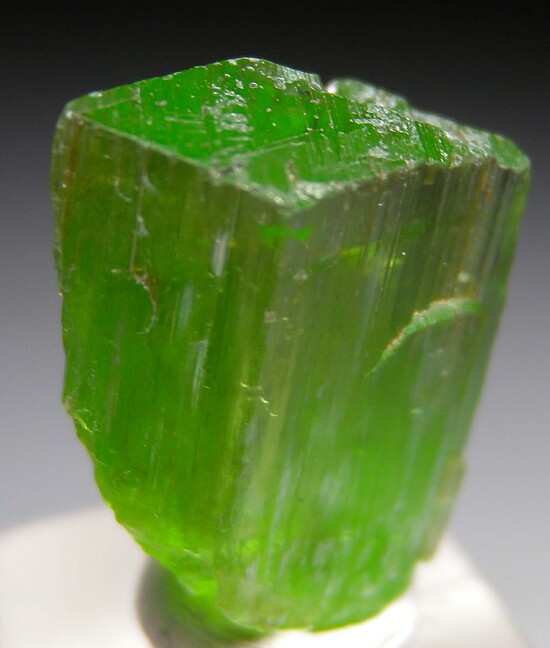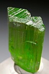 Terminated single Tremolite crystal with bright, vivid green coloration. Transparent, complete all around, with a flat, glassy termination. Most are mere shards or fragments and complete terminated crystals such as this are are much less common. Like a number of other mineral species from Merelani, these Tremolites are considered the world's best of species.